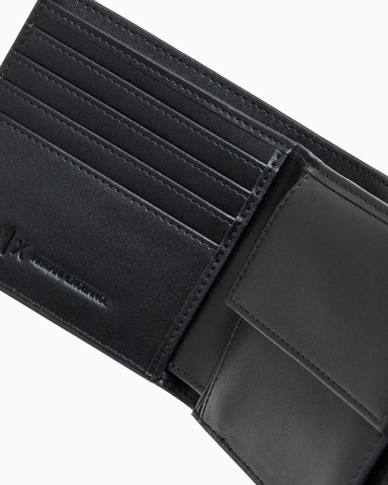 Portafoglio a libro realizzato in materiale resistente dotato di tasca per monete, scomparto per banconote e fessure per carte.