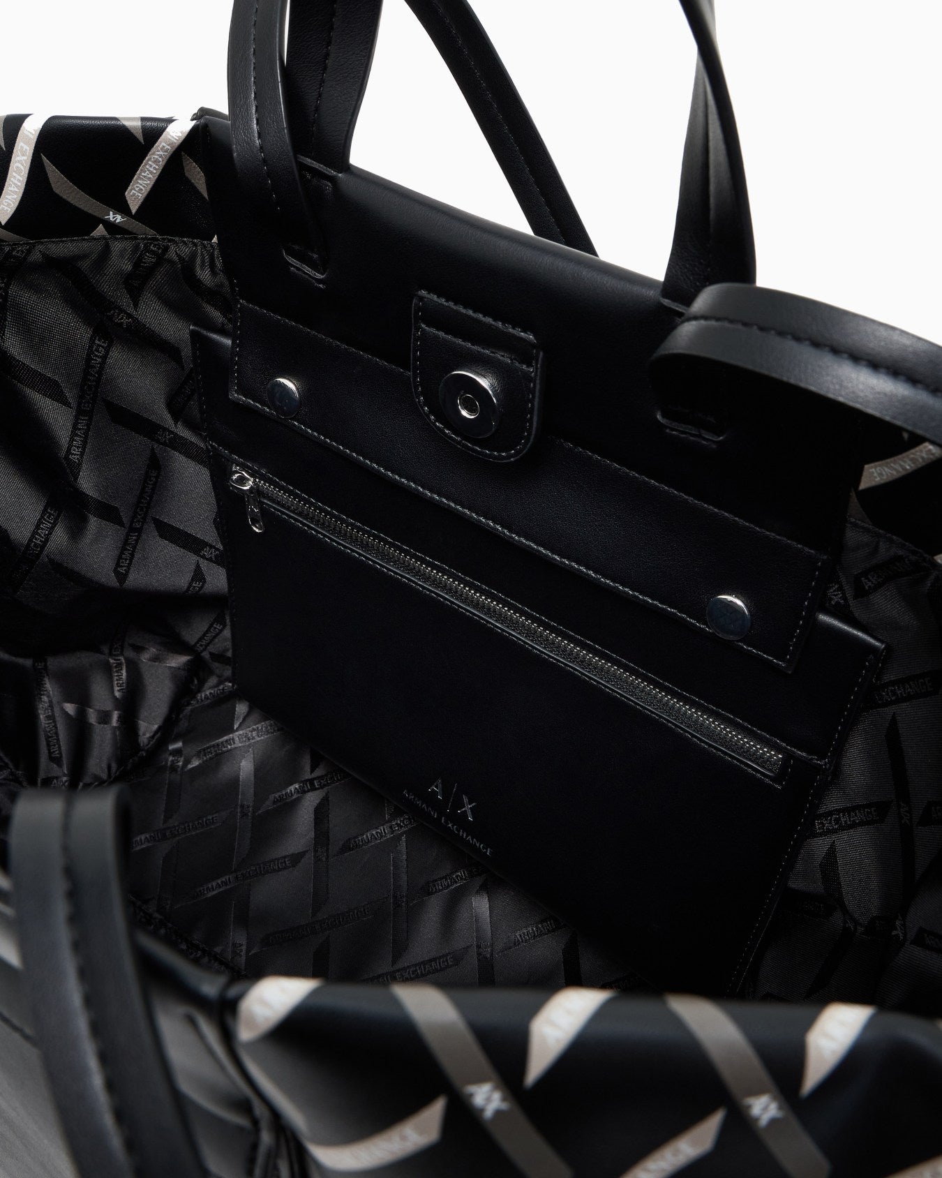 La shopper grande Armani Exchange in nero e verde militare combina eleganza e funzionalità. Presenta una tasca frontale con zip per un accesso pratico e sicuro. Il design logato dona un tocco distintivo e moderno, ideale per chi cerca un accessorio versatile per la vita quotidiana, capace di unire stile e comodità in ogni occasione.