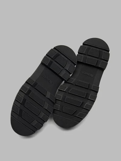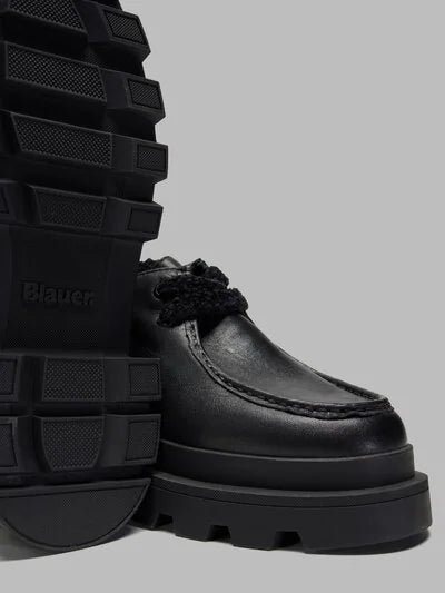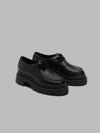 Questo modello presenta una tomaia in pelle con cuciture a vista e allacciatura frontale. La scarpa poggia su una suola platform in gomma con carrarmato pronunciato, garantendo un'elevata aderenza,con soletta in pelle. Si tratta di una calzatura a taglio basso che coniuga l'estetica di un mocassino con la funzionalità di una suola robusta e moderna.