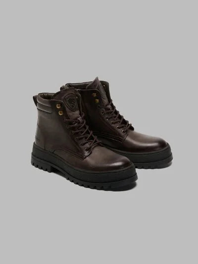Scarponcino urban di ispirazione workwear, in pelle, con un fondo molto consistente ma allo stesso tempo leggero. Doppio collarino per una mobilità del piede più confortevole e allacciatura superiore con ganci che permettono una regolazione ideale. Un scarponcino invernale multi funzione e adatto ad ogni tipo di outfit.
