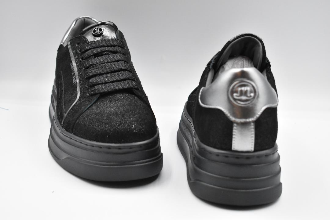 Le sneakers platform Janet&Janet in nero con brillantini uniscono stile contemporaneo e raffinatezza. Il design con effetto glitter aggiunge un tocco luminoso e distintivo, mentre la suola platform garantisce comfort e sostegno durante tutto il giorno. Ideali per valorizzare outfit casual chic con un dettaglio sofisticato.