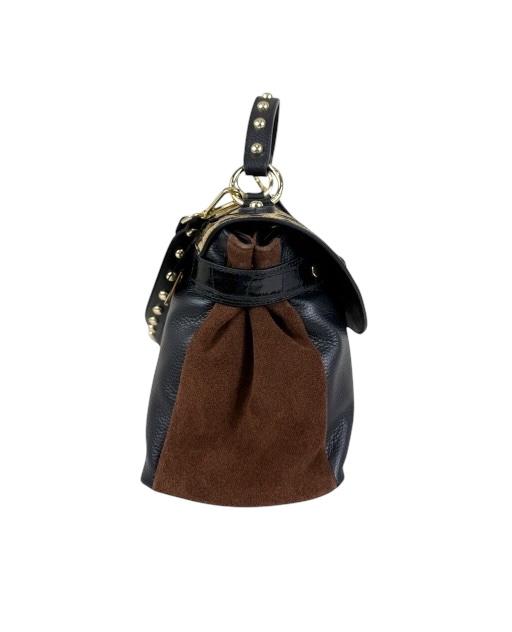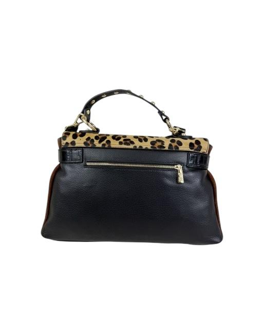 Questa borsa MBRC unisce audacia e stile con la sua combinazione di nero e marrone e la grande patta leopardata in cavallino. Perfetta per chi vuole distinguersi, offre spazio generoso senza rinunciare a un design grintoso e sofisticato. Un accessorio che trasforma ogni look in una dichiarazione di carattere.